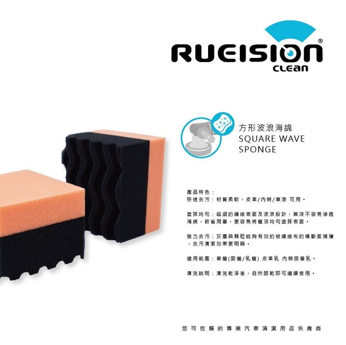 Rueision 波紋輪胎海綿採用立體波浪結構設計, 能有效控制輪胎油用量,讓塗抹更均勻、服貼輪胎曲面, 減少飛濺與浪費,讓輪胎保養變得更快速、乾淨。