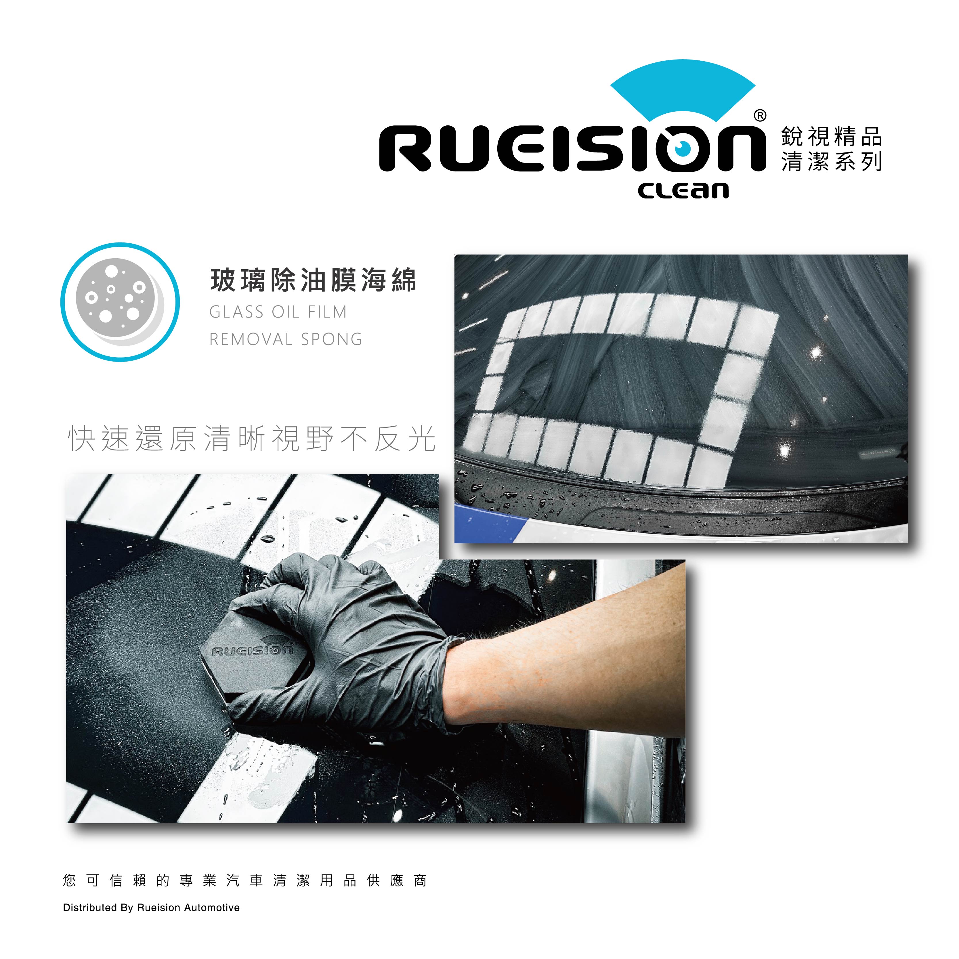 Rueision 羊毛氈玻璃除油膜專用海綿, 採用細緻羊毛氈結構, 能有效去除玻璃表面的油膜與附著物, 在不傷玻璃的前提下, 快速恢復清晰、乾淨的行車視野。