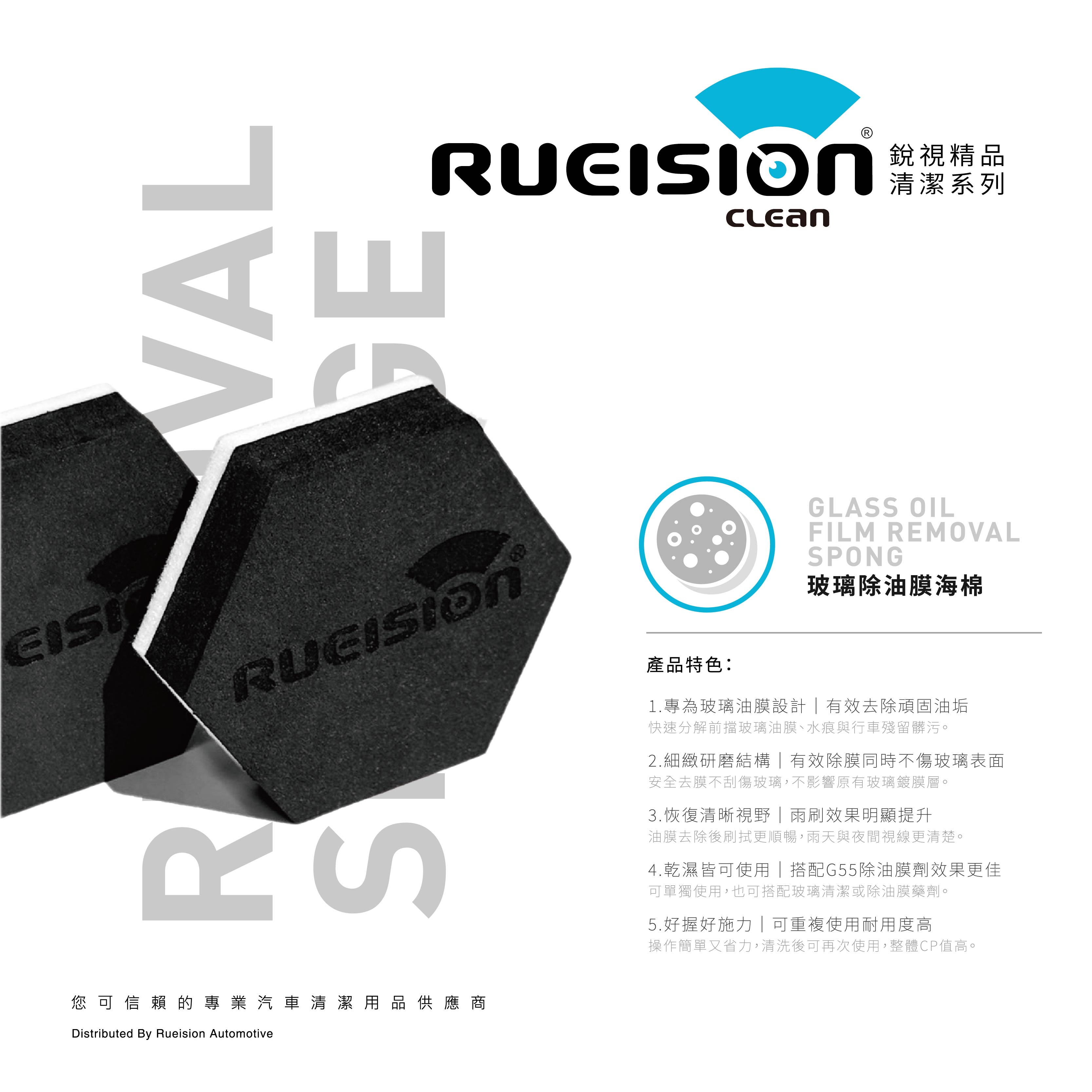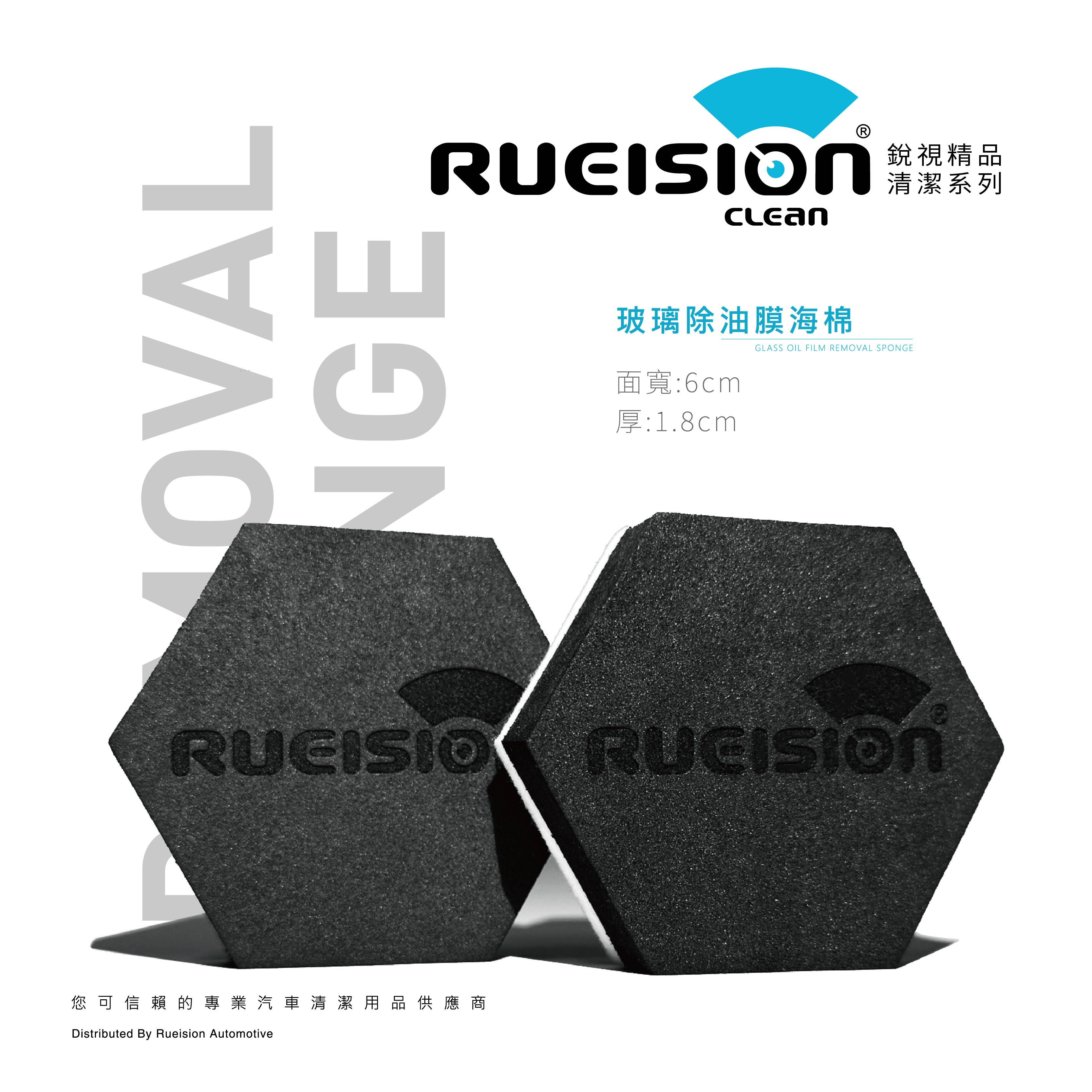 Rueision 羊毛氈玻璃除油膜專用海綿, 採用細緻羊毛氈結構, 能有效去除玻璃表面的油膜與附著物, 在不傷玻璃的前提下, 快速恢復清晰、乾淨的行車視野。