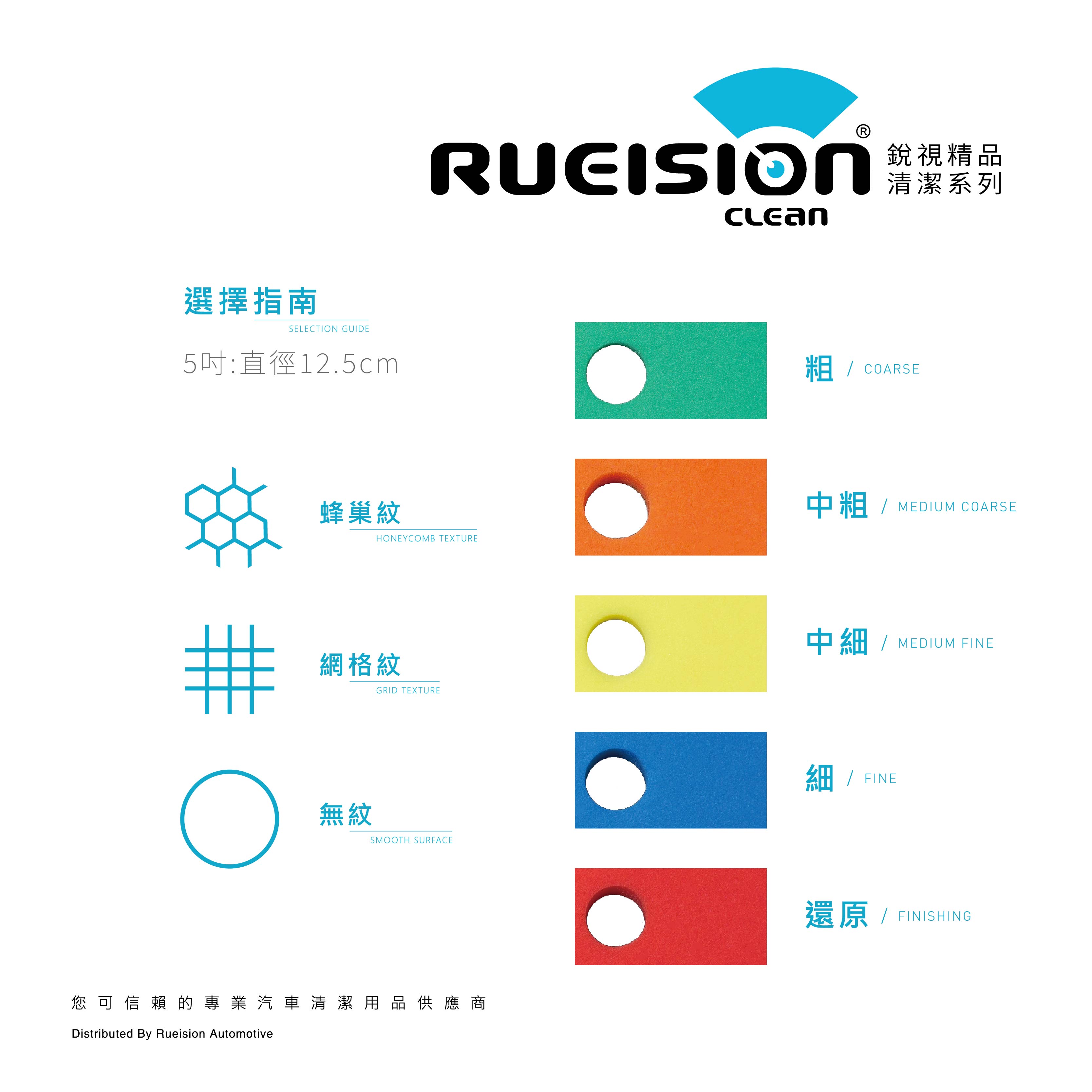 拋光效果除了粗細分級外, 海綿表面結構同樣會影響施工穩定度、散熱與修復均勻性。 Rueision 拋光海綿依不同施工需求,設計三種表面結構: