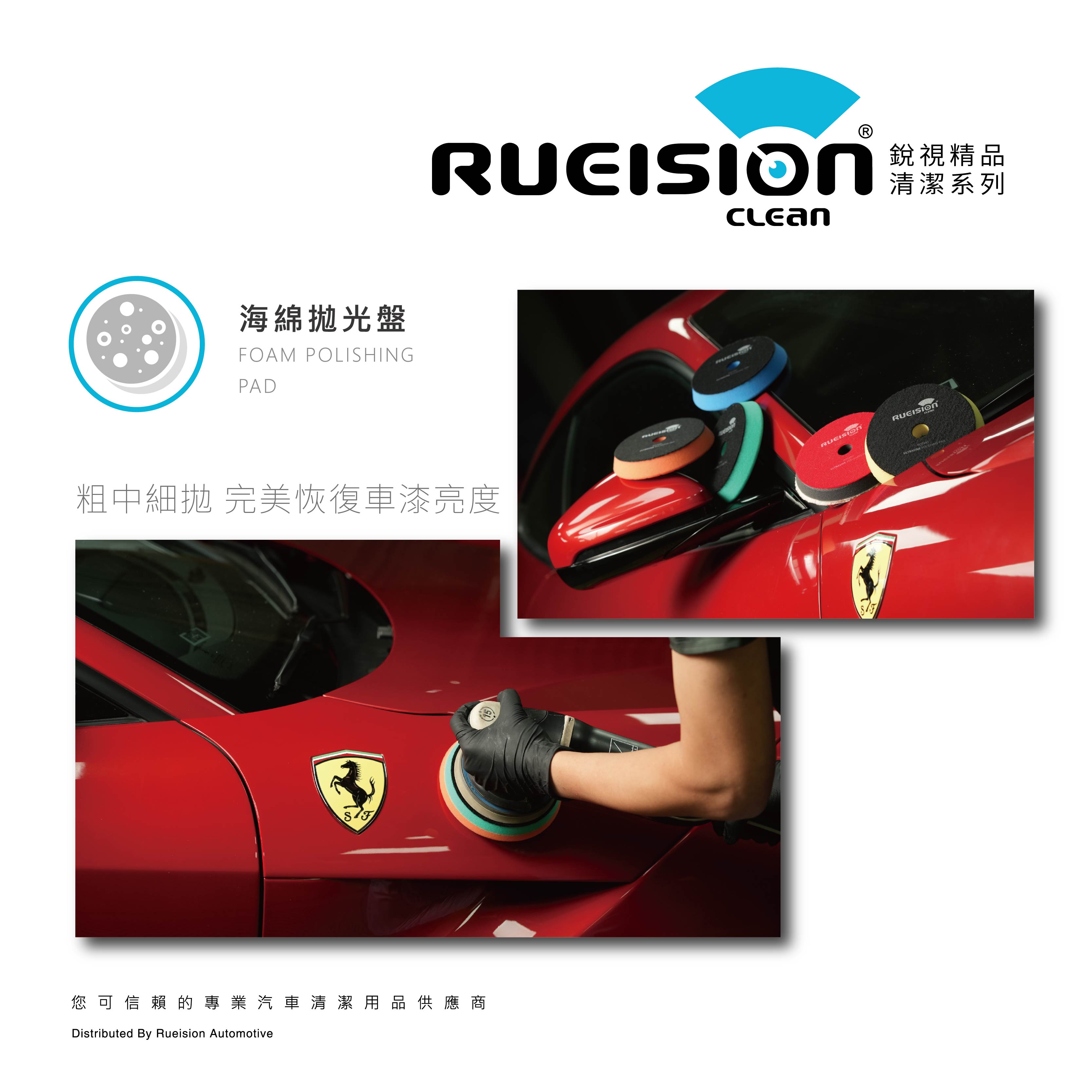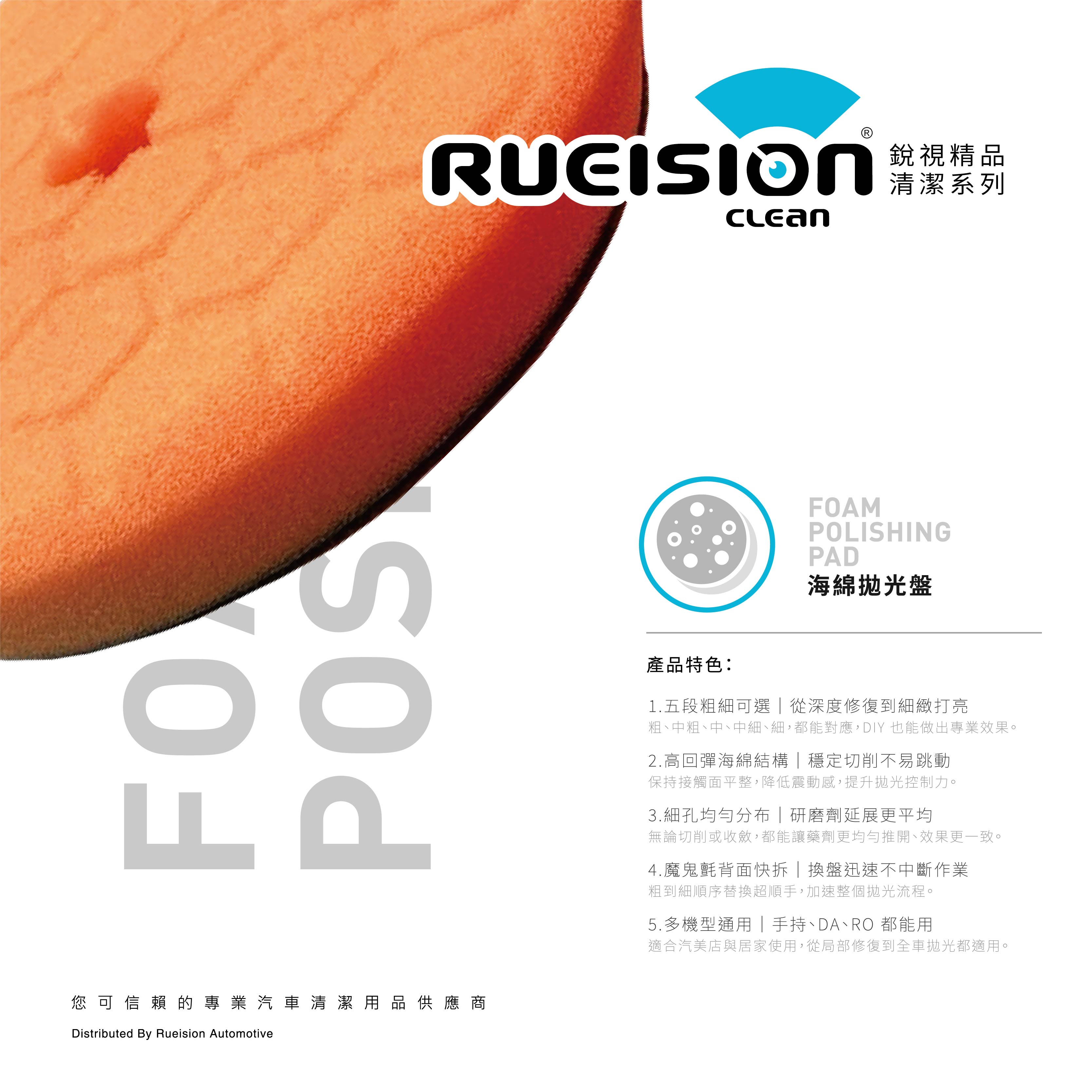Rueision 拋光海綿盤採用高彈性海綿結構, 施工時貼合漆面、不易跳動, 能有效提升修復均勻度與穩定性, 適合 DIY 車主與專業施工使用。