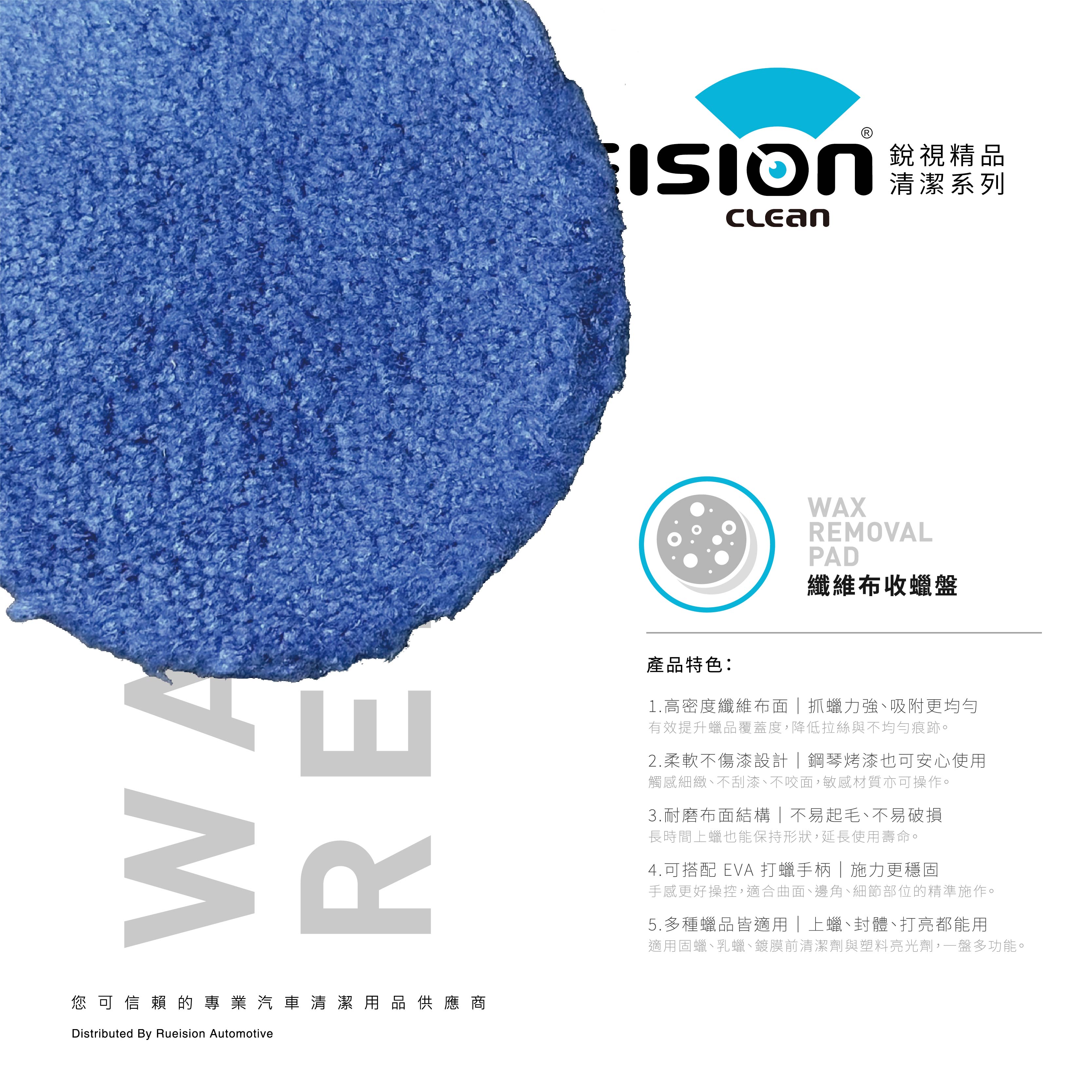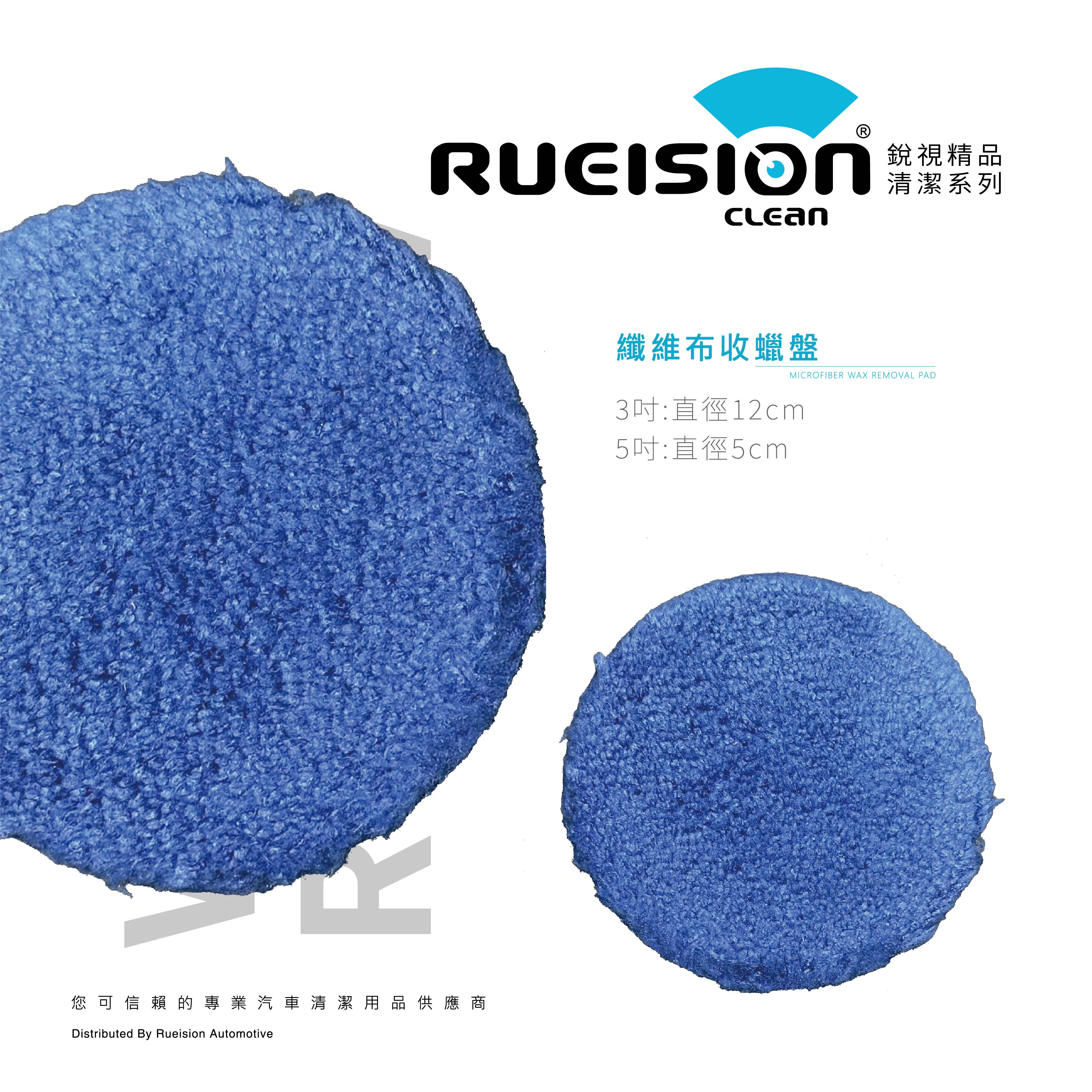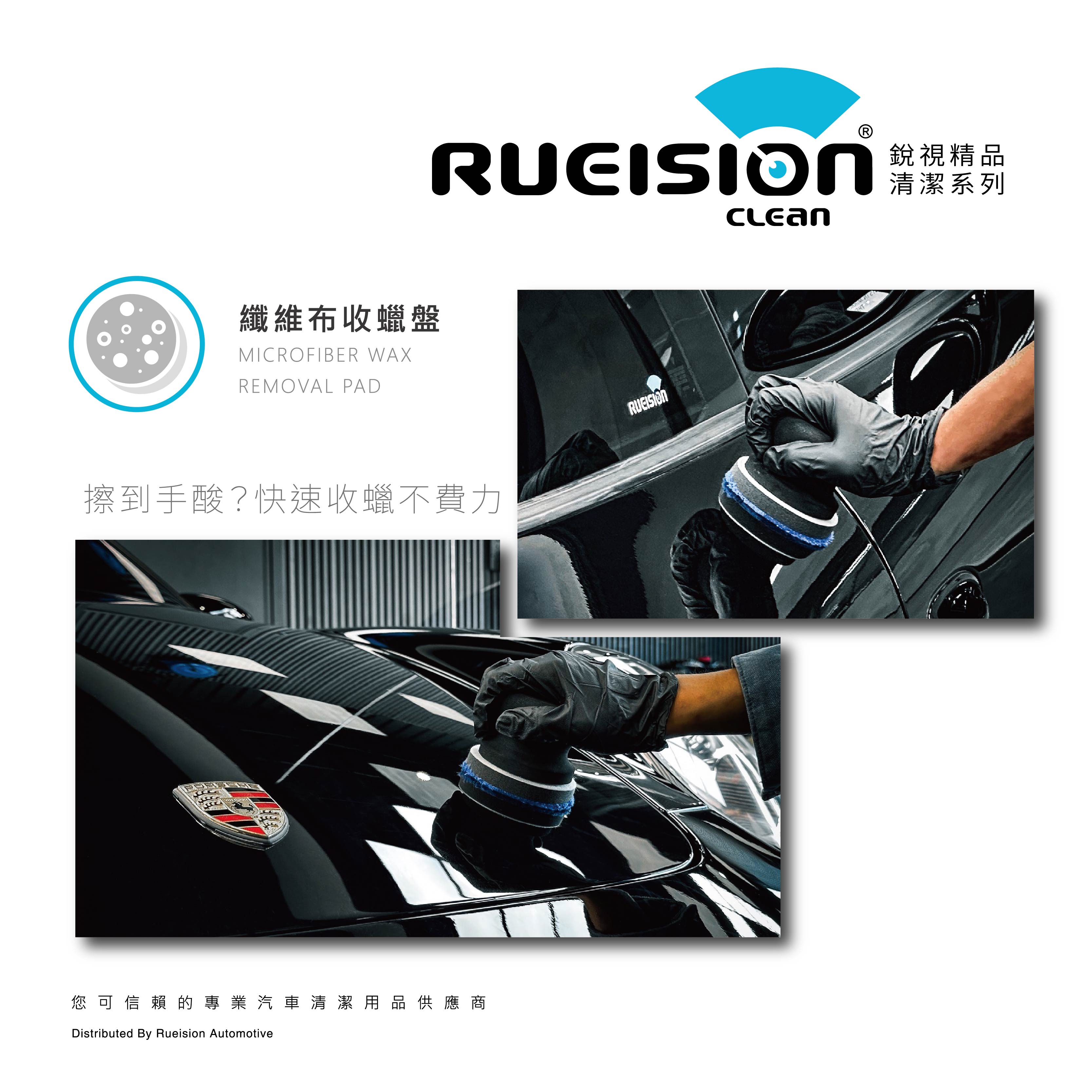 Rueision 纖維布收蠟盤採用高密度纖維布表面, 能有效帶走多餘蠟層與殘留油膜, 讓漆面快速回復乾淨、均勻、不留痕的完成狀態, 適合日常保養與專業施工作為最後收尾使用。